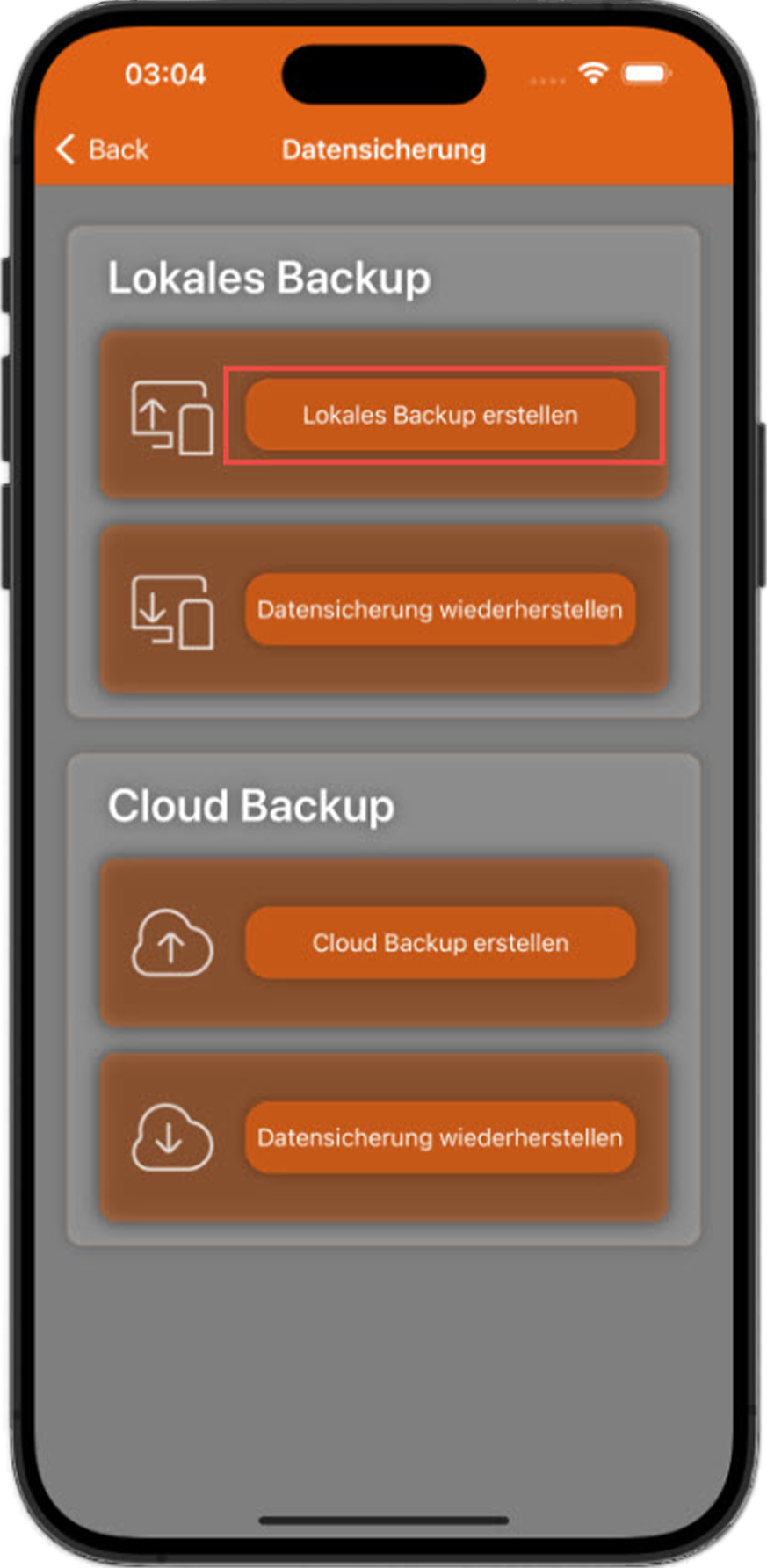 Mit einem Klick auf den Button "Datensicherung" können Sie Ihre Daten auf dem entsprechenden Gerät lokal abspeichern. Die Daten werden auf Ihrem Gerät unter Dateien gesichert.