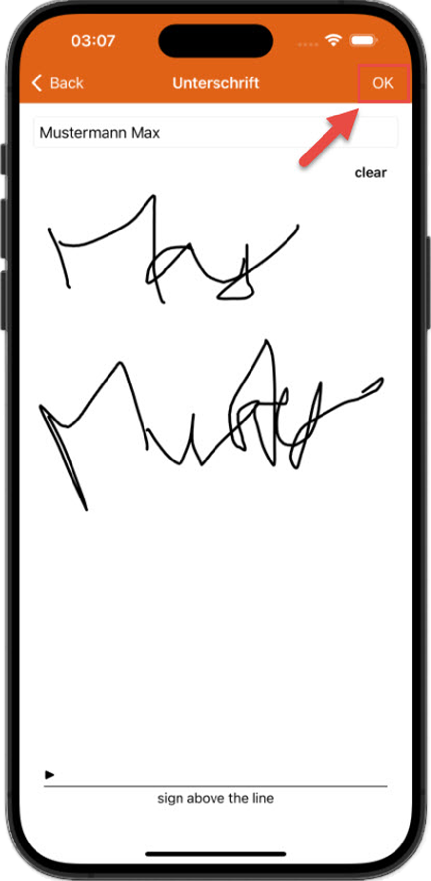 Danach kann die ausgewählte Person unterzeichnen und mit einem Klick auf "OK" die Unterschrift speichern: